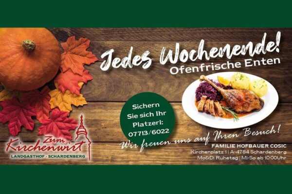 Kirchenwirt Schardenberg | Kirchenplatz 1 | A-4784 Schardenberg | Telefon: +43 7713 6022 | Fax: +43 7713 7395 | E-Mail: info@kirchenwirt-schardenberg.at